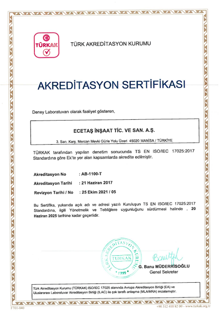 ECETAŞ Deney Laboratuvarı, faaliyetlerini sürdürdüğü Ecetaş İnşaat ve Sanayi Ticaret A.Ş. tüzel kişiliği altında kurulmuştur. “TS EN ISO / IEC 17025 – Deney ve Kalibrasyon Laboratuvarlarının Yeterliliği İçin Genel Şartlar” Standardına uygunluk kapsamında Türk Akreditasyon Kurumu (TÜRKAK) tarafından AB-1100-T numarasıyla akreditasyon belgesi alınmıştır.